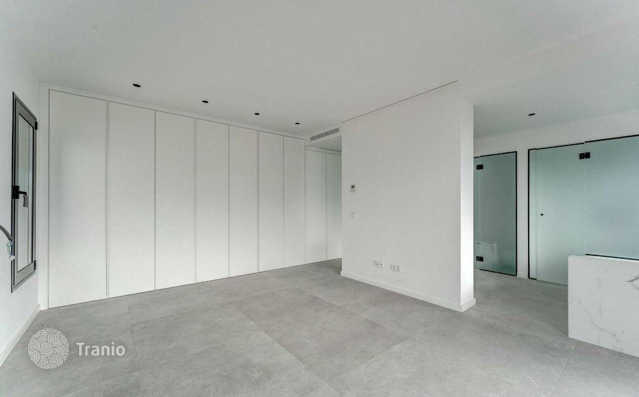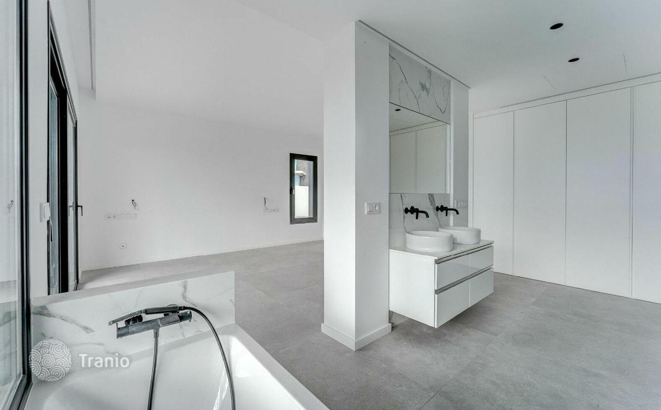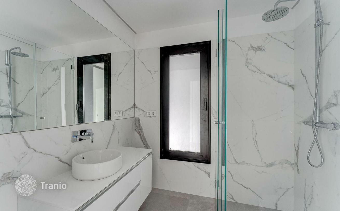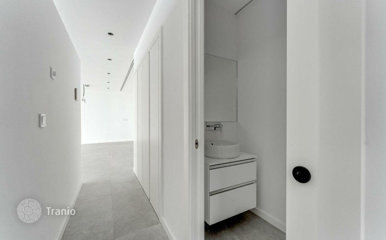 Красивая лестница из бетона и стекла ведет на верхний этаж, большое открытое пространство с кухней открытой планировки и большой гостиной-столовой с выходом в зону солярия с бассейном и террасой с видом на поле для гольфа и море. На этом этаже также имеется кладовая и гостевой туалет.