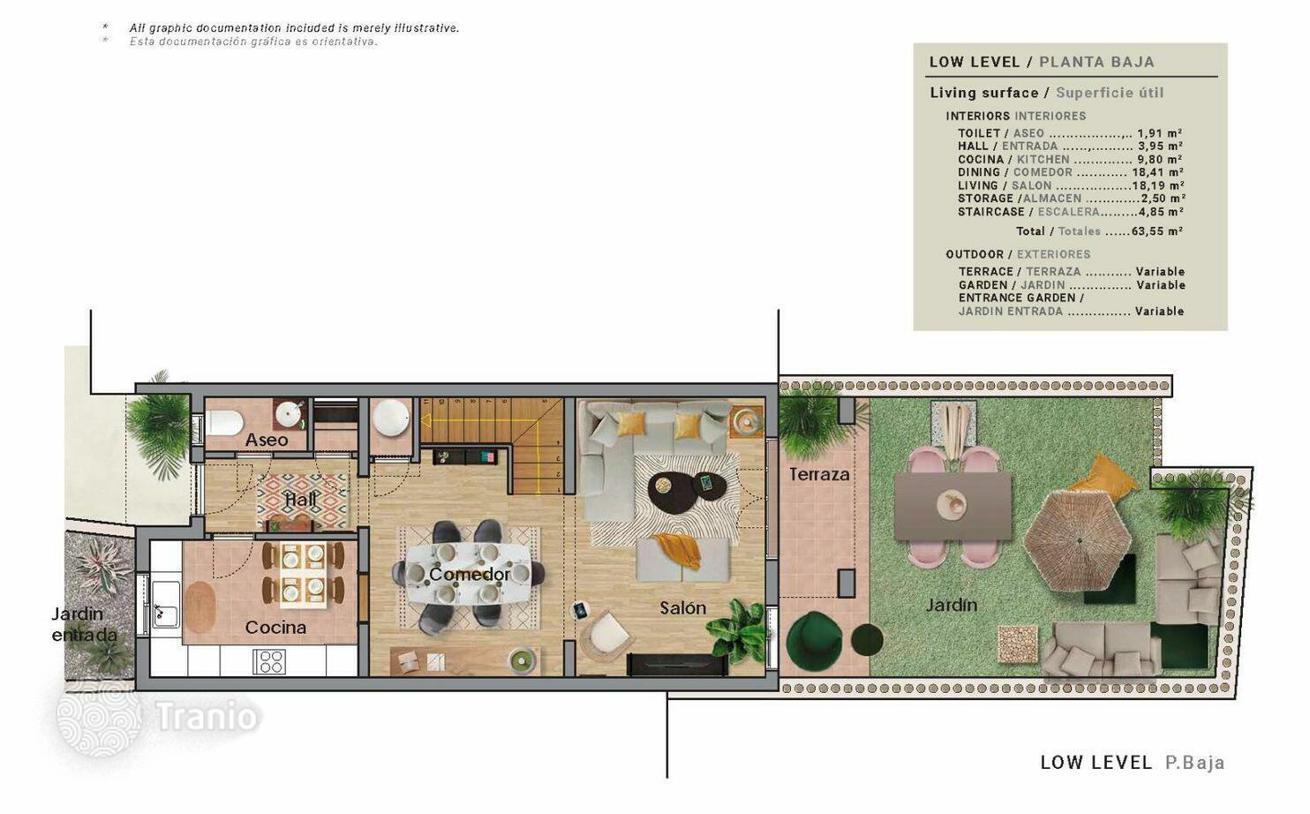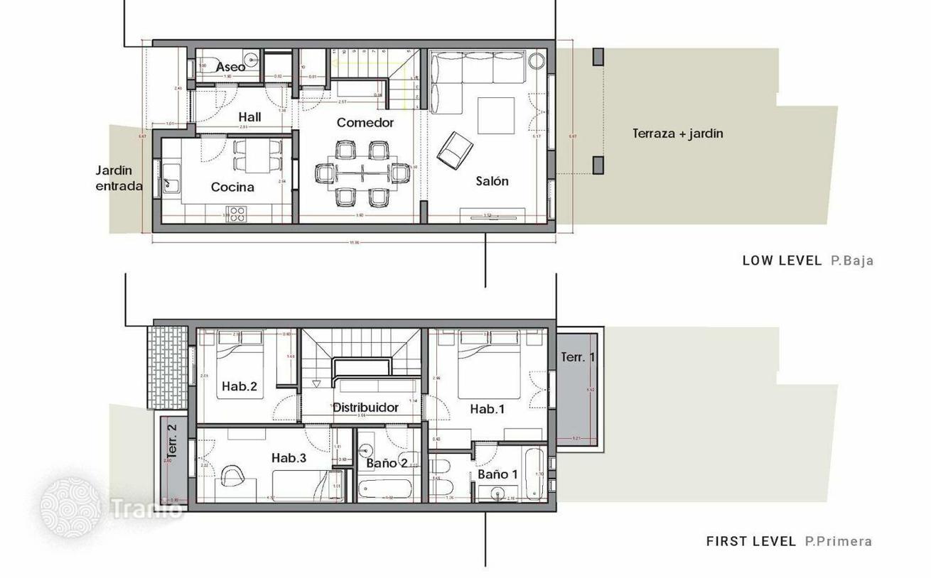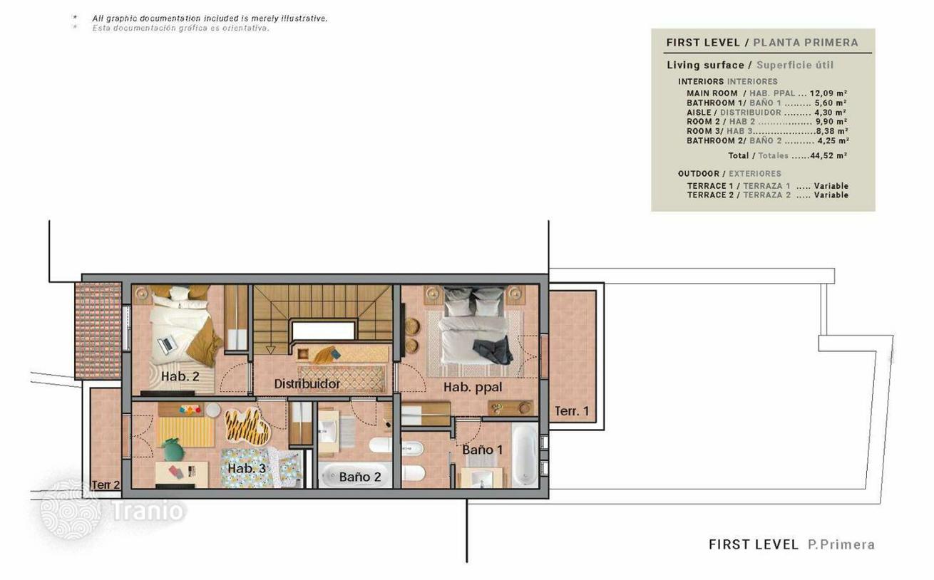 Первый этаж 64 м² — это социальное пространство. При входе нас встречает просторная столовая, располагающая к семейным посиделкам. Рядом с ней гостиная, идеально подходящая для отдыха. Кухня, не только меблированная, но и полностью оборудованная, — идеальное место для любителей гастрономии. На этом этаже также находится практичный туалет и кладовая. Настоящей изюминкой этого этажа является терраса площадью 57 м², с которой имеется прямой доступ к коммунальным зонам урбанизации: бассейнам, солярию и другим идеальным местам для отдыха на свежем воздухе.