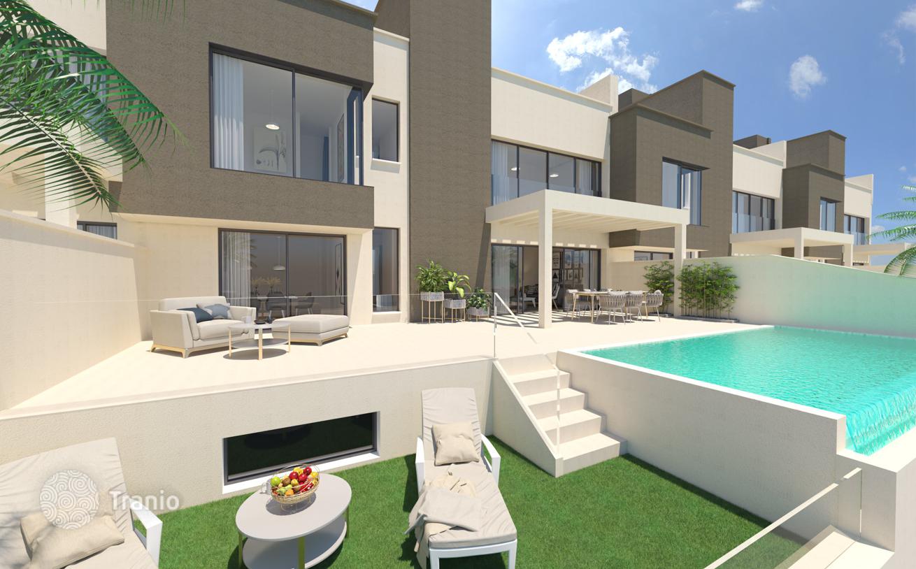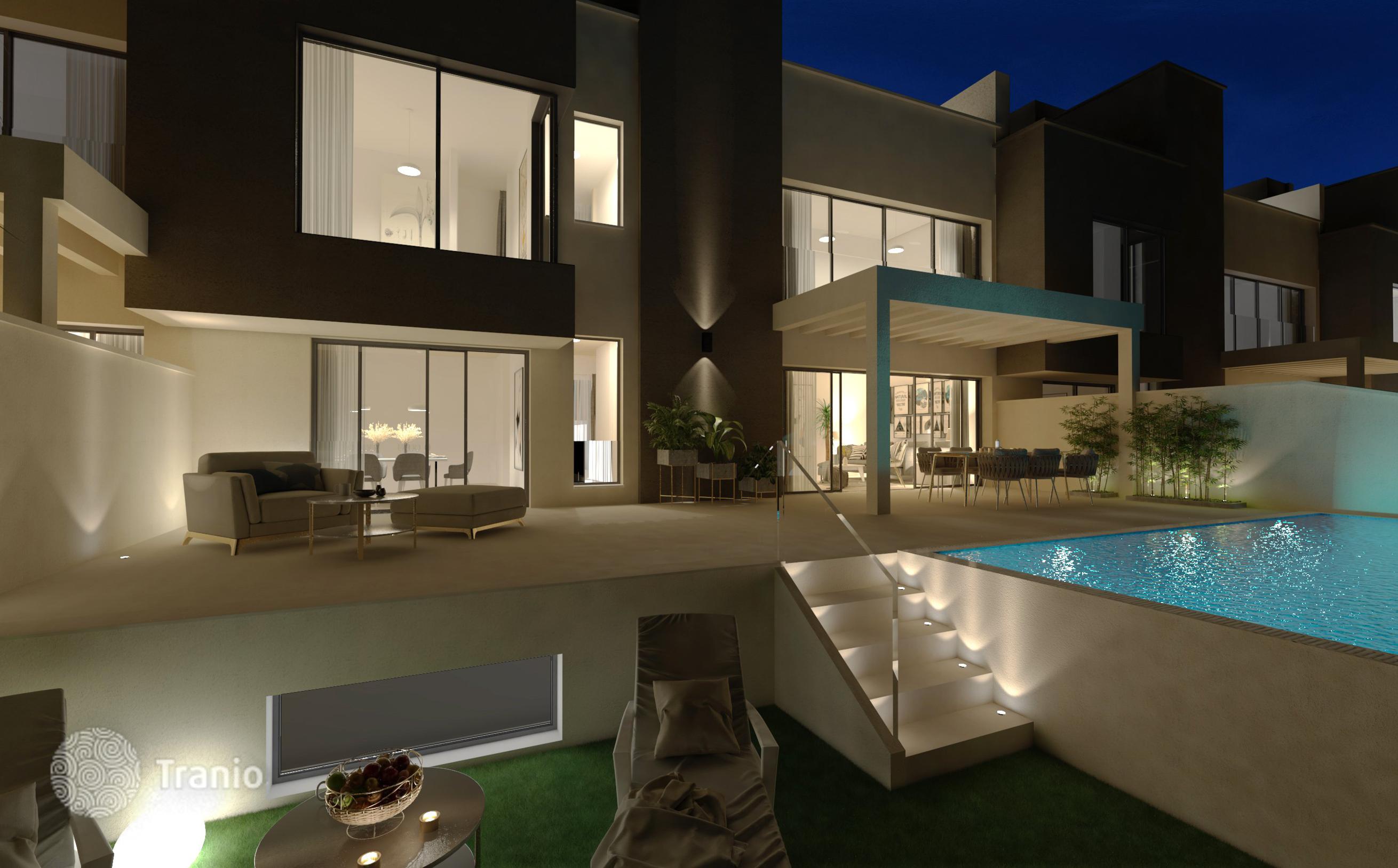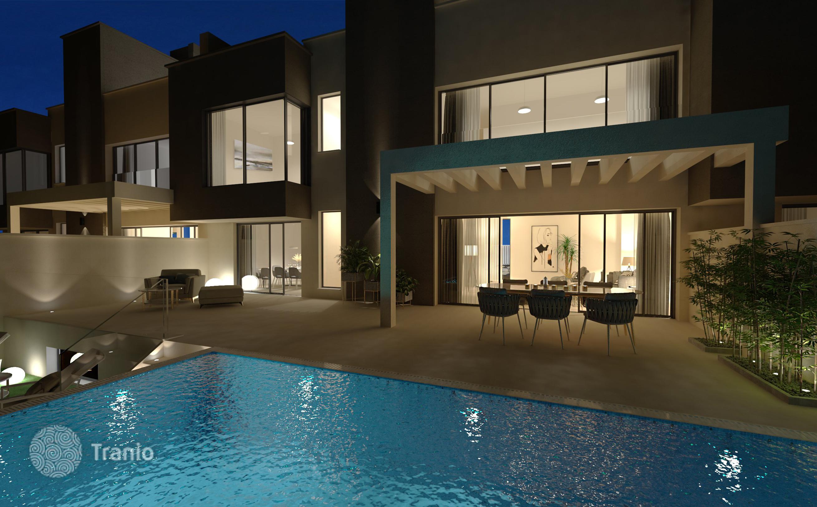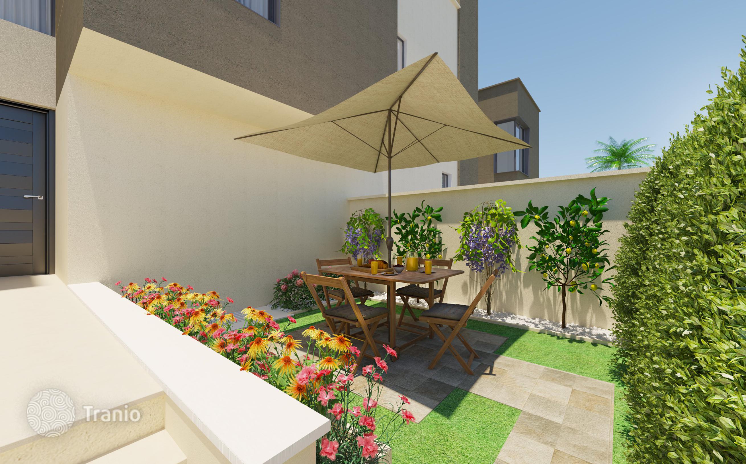 Предлагается трехэтажный таунхаус с бассейном и солнечной террасой, садом, подземным гаражом и парковкой на две машины, террасой на крыше, видом на горы и океан.