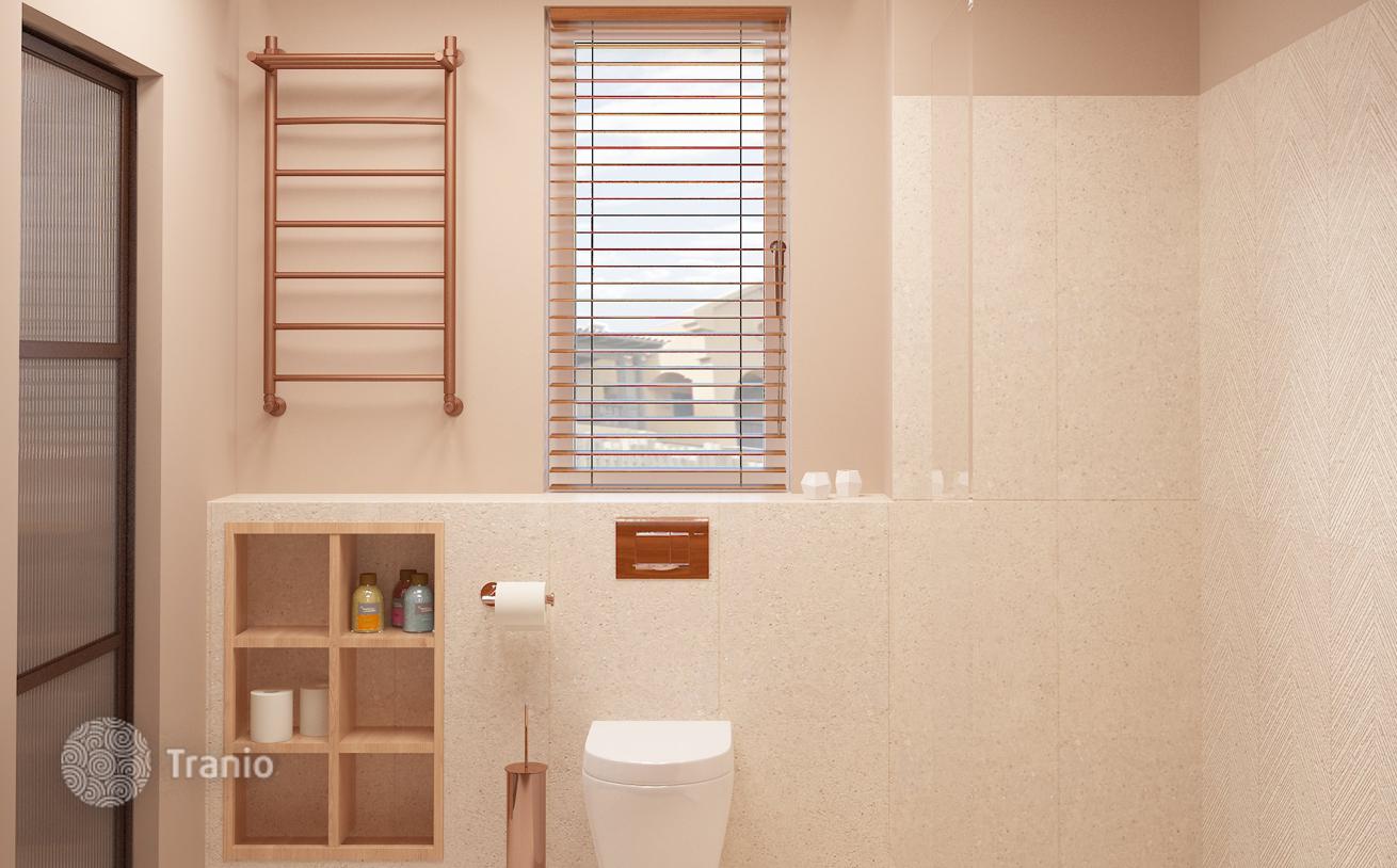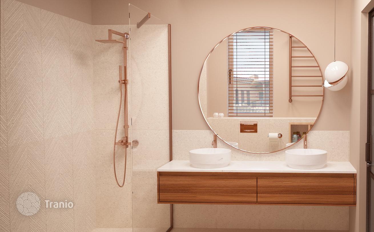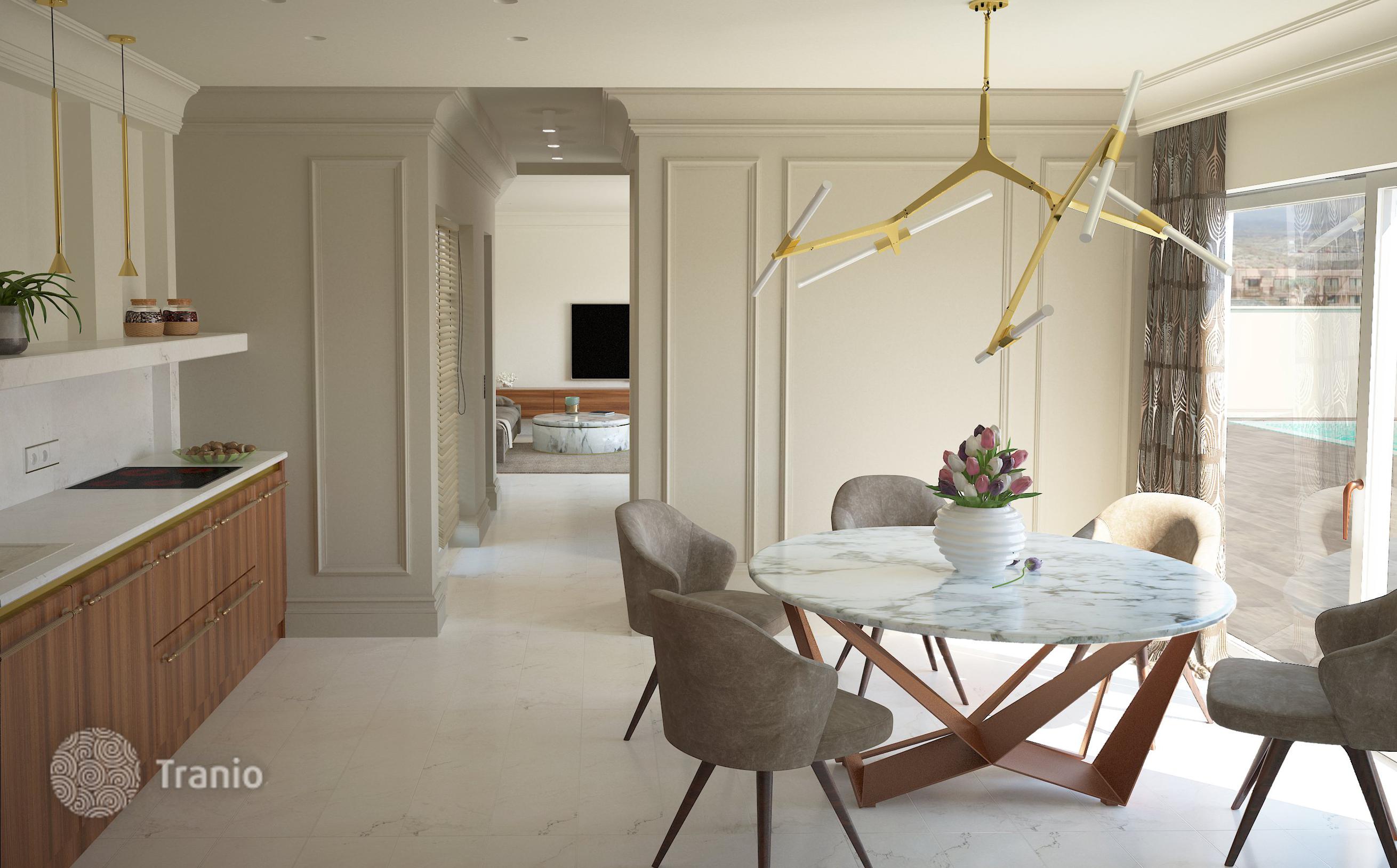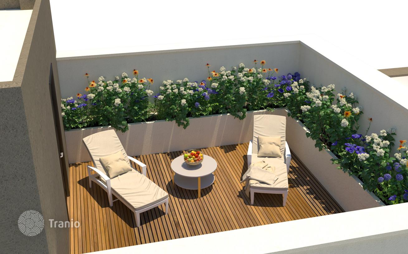 Предлагается трехэтажный таунхаус с бассейном и солнечной террасой, садом, подземным гаражом и парковкой на две машины, террасой на крыше, видом на горы и океан.