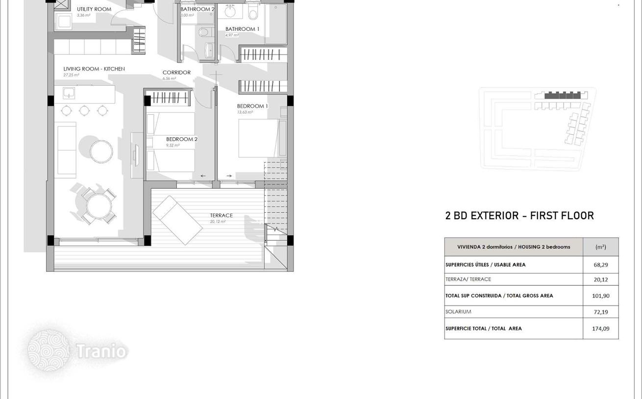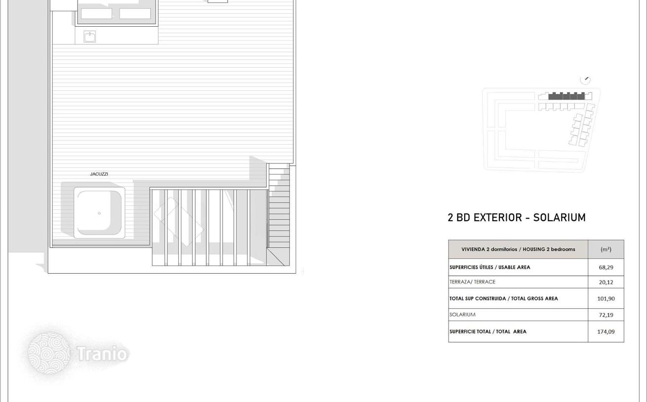 В этом красивом пентхаусе есть 2 спальни и 2 ванные комнаты, гостиная и современная кухня. К гостиной примыкает очень красивая терраса 20 м² + терраса на крыше 72 м².