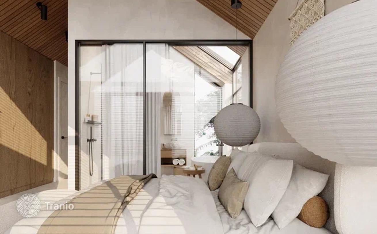Предлагаются меблированные виллы в стиле барн хаус с инфинити-бассейнами 15 м² и видами на рисовые поля, парковочными местами.
