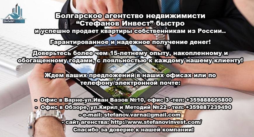 Болгарское агентство недвижимости Стефанов Инвест быстро и успешно продает квартиры собственникам из России.. Гарантированное и надежное получение денег! Доверьтесь более чем 15-летнему опыту, накопленному и обогащенному годами, с лояльностью к каждому нашему клиенту!
