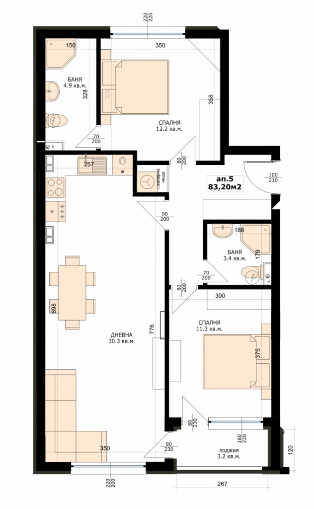 Квартира расположена на 2-м этаже новостройки с лифтом. Общая площадь 97 кв.м. Планировка: коридор, кухня-гостиная- 33 кв.м., две спальни, две ванные комнаты с туалетом, кладовая и терраса.