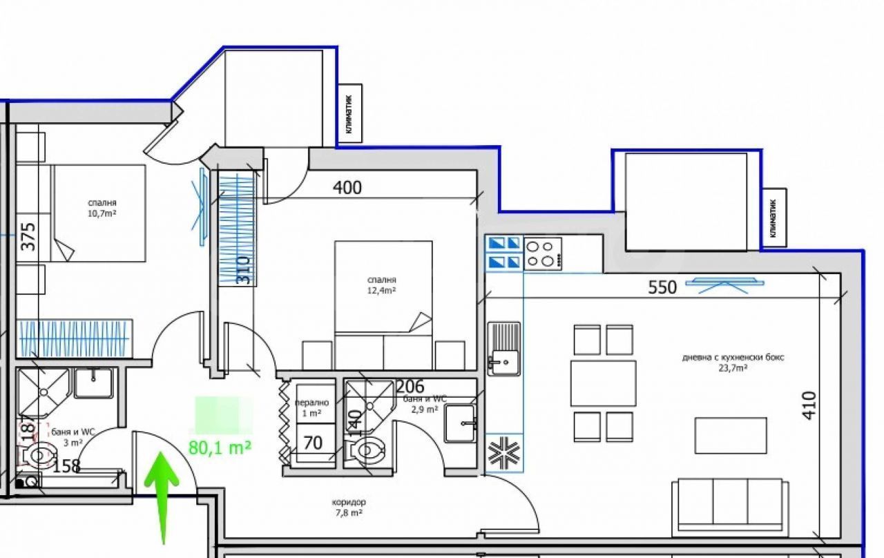 Недвижимость расположена на 3 этаже и имеет общую площадь 94,16 кв. метров: коридор, прачечная, две ванные комнаты с туалетом, две спальни с балконом, гостиная/кухня - 23,7 кв. метров. Сдается с отделкой по БГС (оштукатуренные стены и полы со стяжкой), качественные окна, выходы для коммуникаций, с теплоизоляцией по стандарту в новостройке.