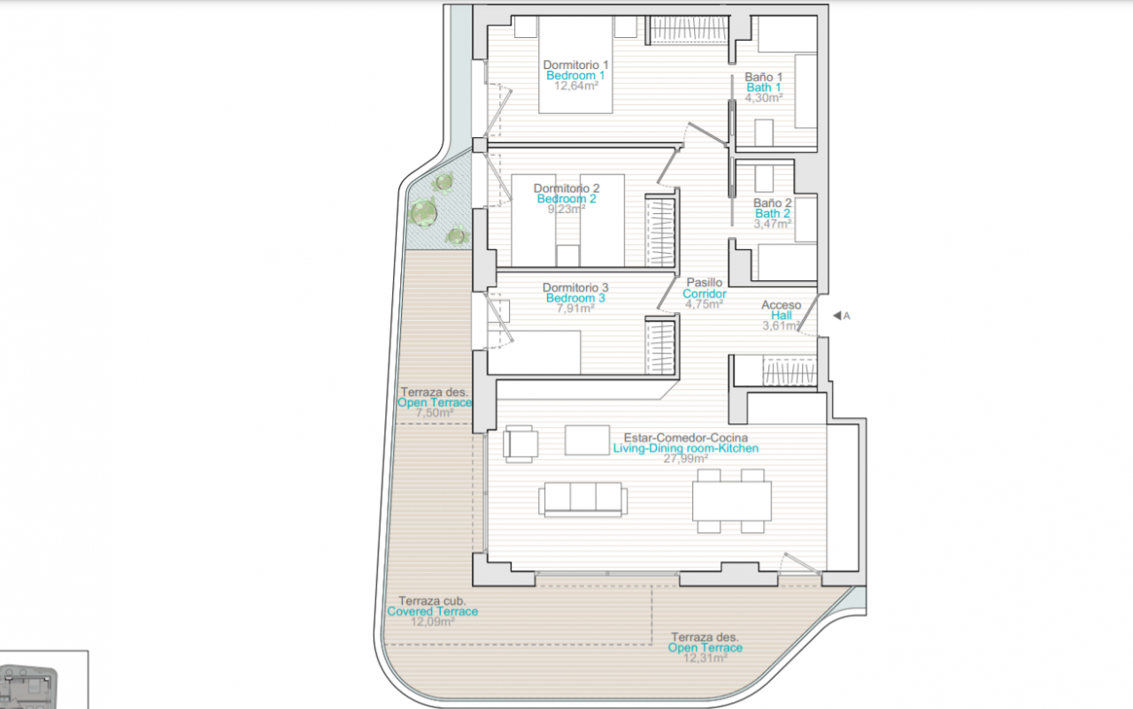 Квартира на пятом этаже общей площадью 106 кв. м. В квартире три спальни, две ванные комнаты, гостиная совмещенная с кухней и обеденной зоной, а также две террасы с потрясающим видом на море. Общая площадь террас 32 кв. м.