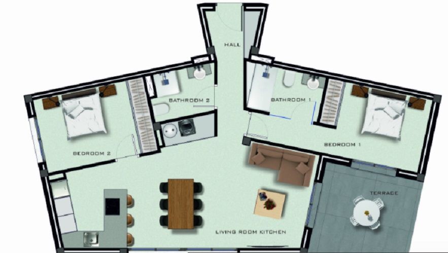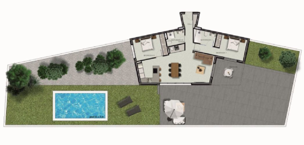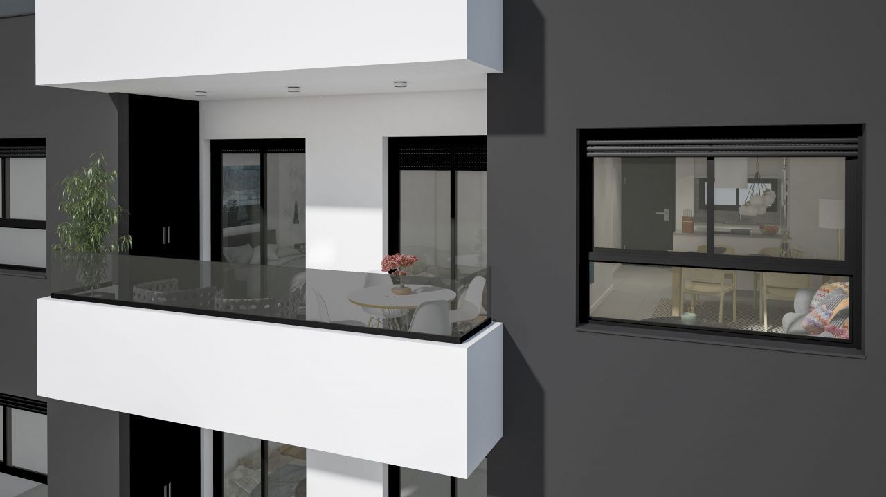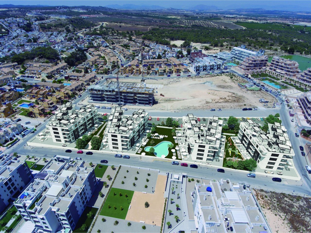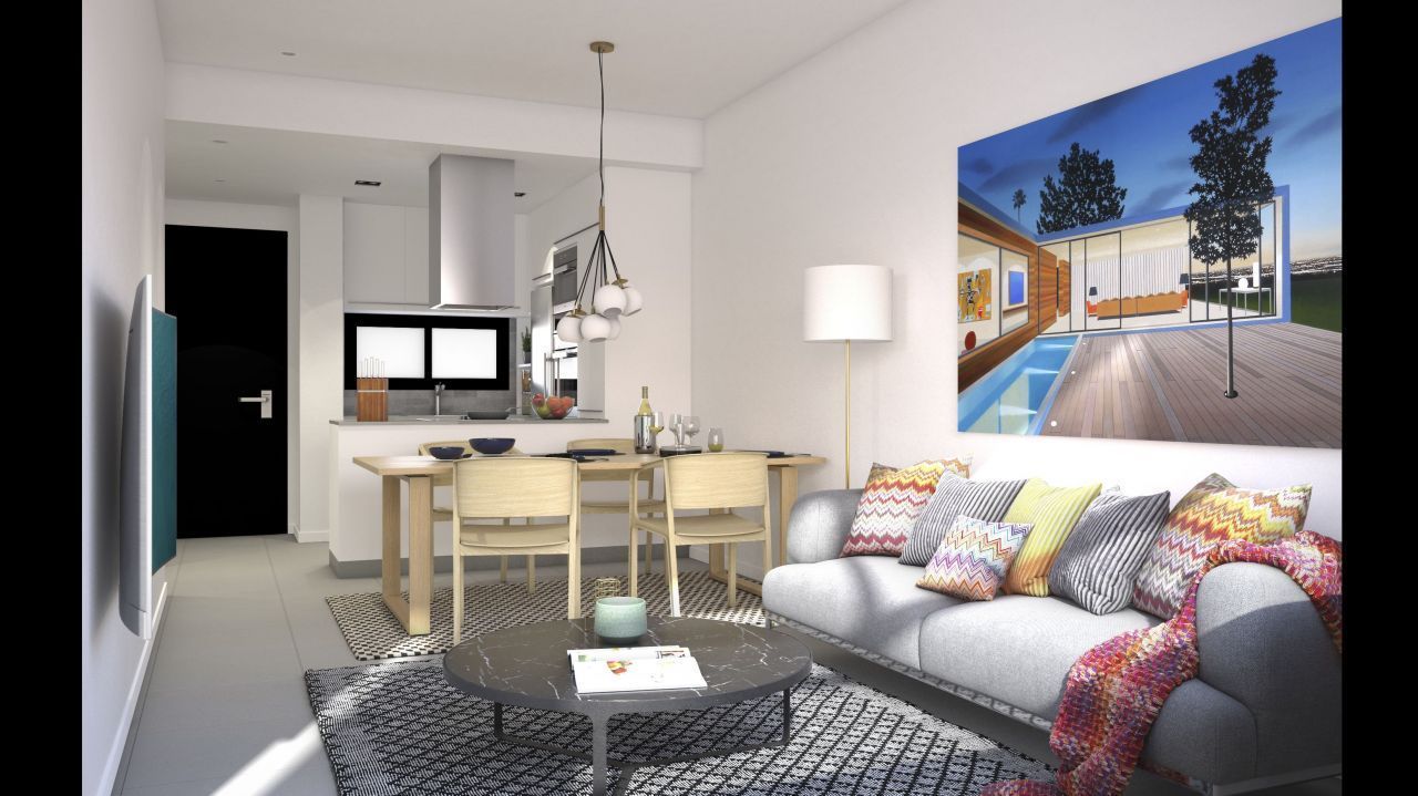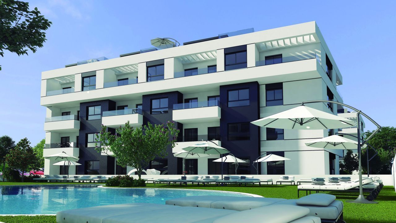 Современная квартира площадью 86,58 кв. м. расположена на нижнем этаже, состоит из гостиной, совмещенной с кухней, двух спален, двух ванных комнат, террасы площадью 10 кв. м. с видами на окрестности и очень просторного собственного дворика площадью 251,3 кв. м., где можно оборудовать зону отдыха и барбекю. Квартира находится в закрытом комплексе с общественным бассейном, стоянкой для автомобилей и зелеными зонами.